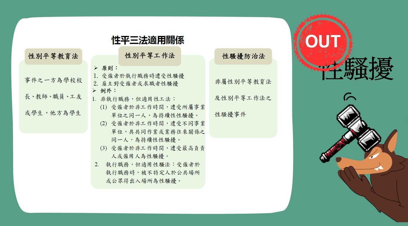 人事室特別製作小圖卡,提供大家快速瞭解性平三法適用關係重點,希望大家共同努力打造健康安全的友善職場。 |
