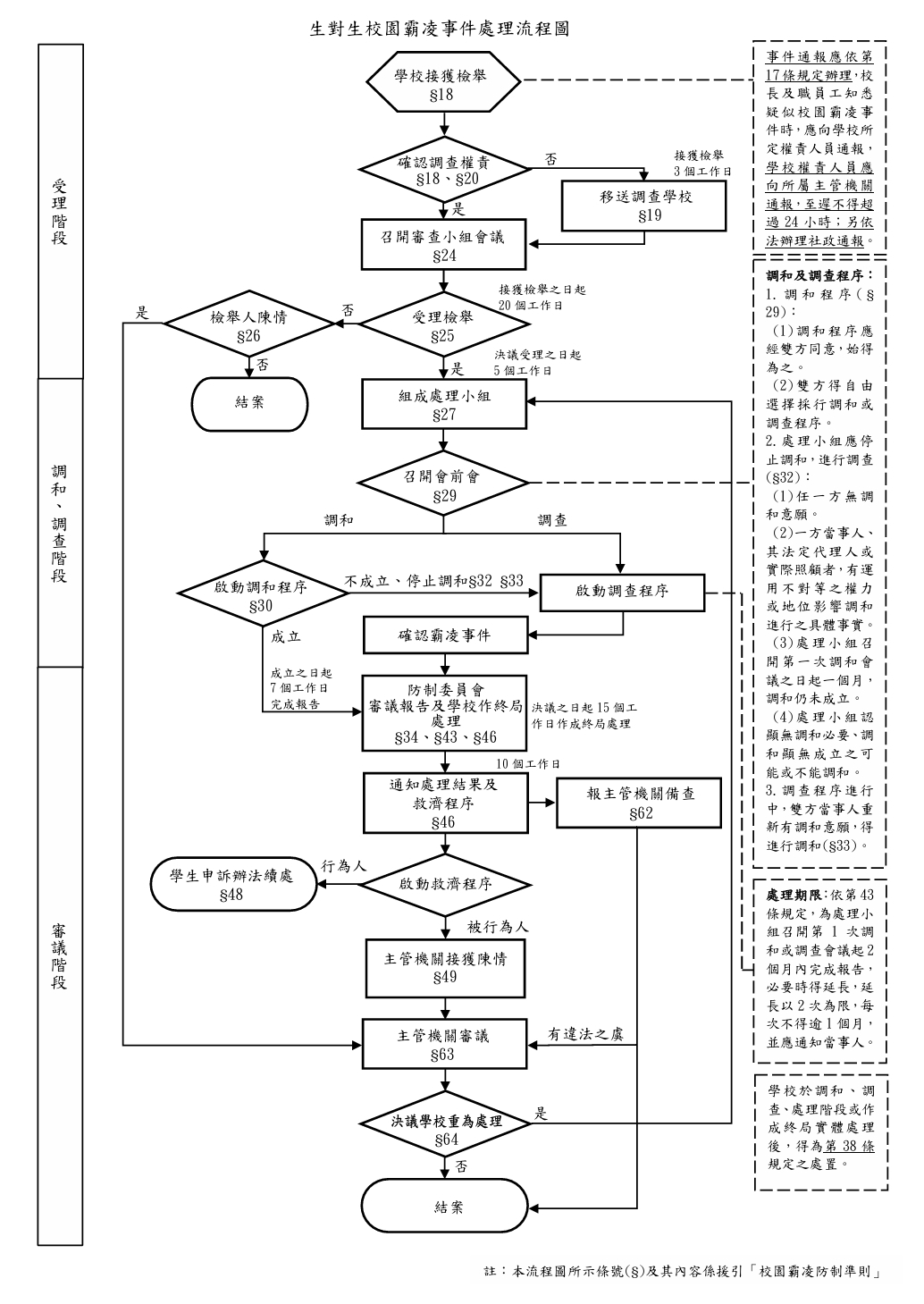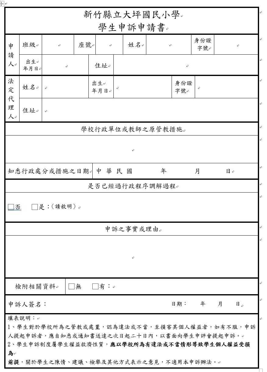 新竹縣大坪實小113學年度學生申訴評議委員會組織要點 中華民國113年8月28日校務會議通過 一、依據:本校「教師輔導與管教學生辦法」第四十九條。 二、 目的: 1、透過學生正式申訴管道,保障學生權益,促進校園倫理。 2、培養學生理性態度,建立申訴管道,發揮民主教育功能。 三、本校為處理學生申訴案件,應設學生申訴評議委員會(簡稱申評會)。 申評會置委員5人,由校長就下列人員聘(派)兼之: (一)家長代表1人。(不得少於五分之一) (二)學校行政人員代表2人。 (三)教師代表1人。 (四)法律、教育、兒童及少年權利、心理或輔導專家學者1人。 (附註:至少一人。) (五)學生代表:0人。(附註:學校得自行決定是否聘任學生代表) 四、申訴要件:符合下列要件者得由學生之父母或監護人提出申訴 1、具學生身分之本校在學學生。 2、學校對其所為之懲罰行為或行政處分,損及其受教機會者。 3、經正常行政程序處理,仍無法解決者。 五、 申訴流程: 1、學生收到行為處分通知書,送達之次日起二十日內,向學校學生申訴評議委員會提出申訴。 2、學生申訴評議委員會於收到申訴書之次日起二十日內,開會作成評議決定書。 3、評議決定書送達當事學生。 4、如不服決定書之判決,得於評議決定書送達之次日起三十日內,依法向本校學生申訴評議委員會再提起訴願。