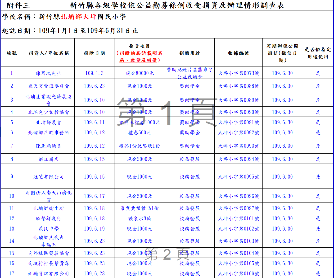 109年1-6月公益勸募條例收受捐資及辦理情形(公開徵信)